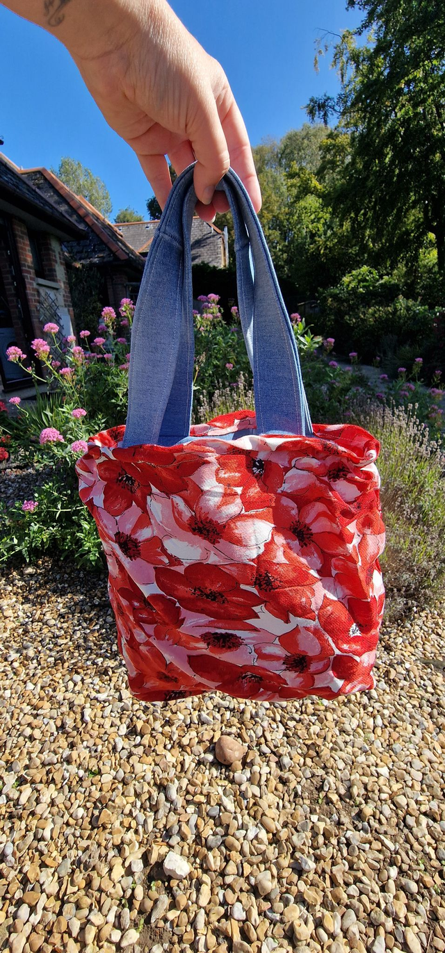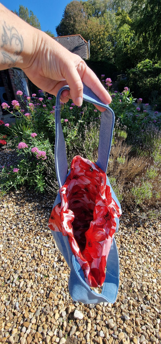 This beautiful handmade tote bag has been created using recycled denim jeans and a repurposed floral dress, giving new life to pre-loved fabrics.